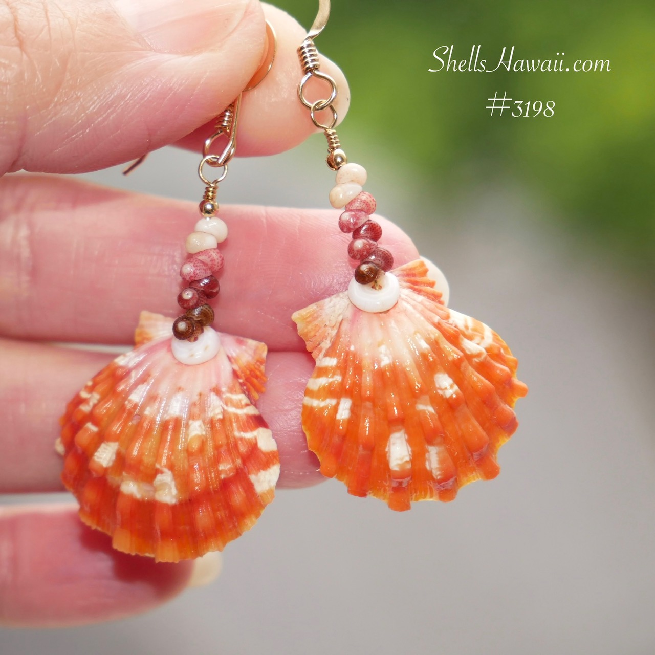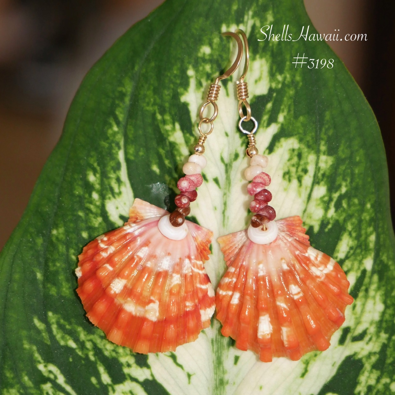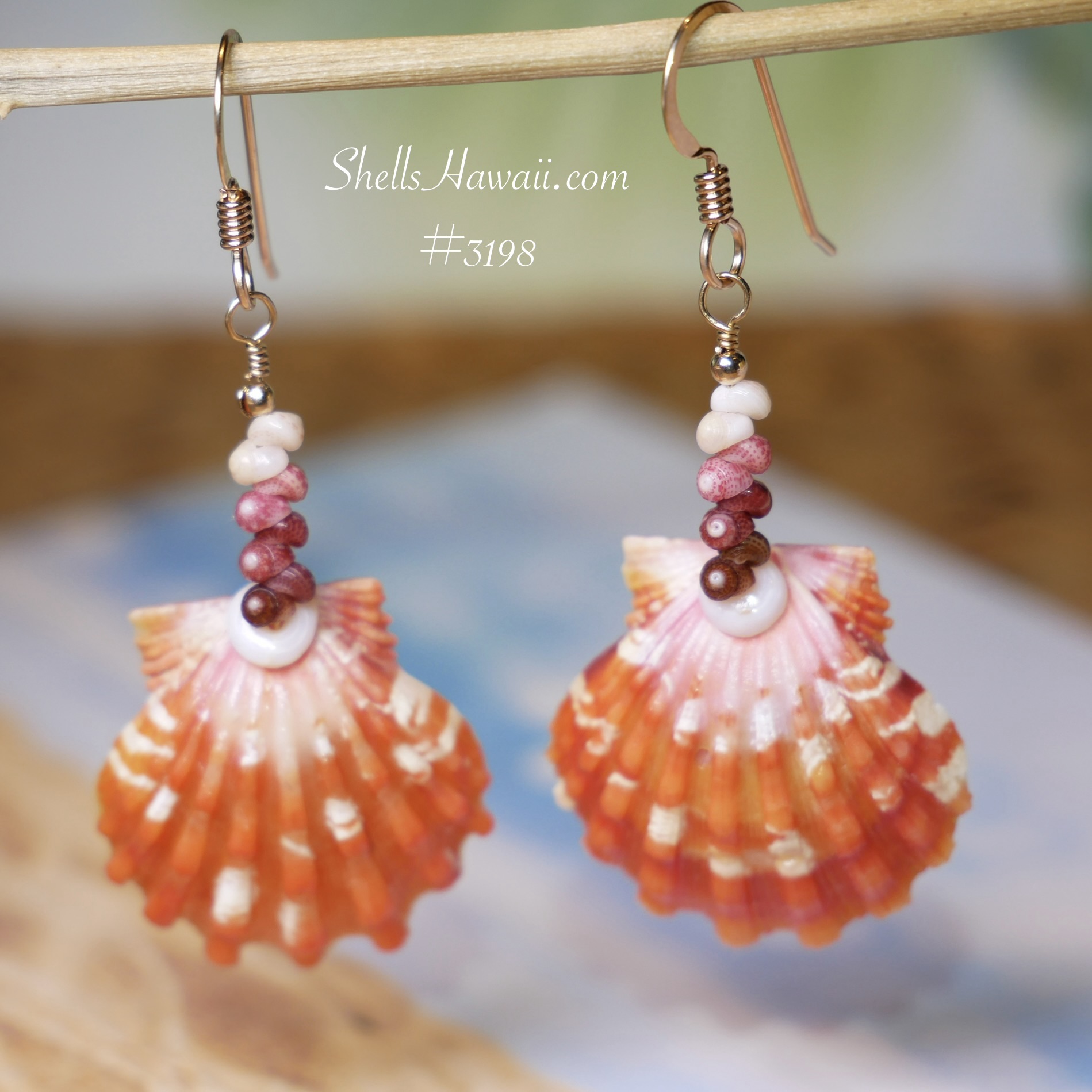 This beautiful pair features sunrise shells paired with tiny Kahelelani shells from Niʻihau in a soft ombre drop. The Kahelelani shells blend from brown into pink and off white tones, creating a warm, natural gradient.