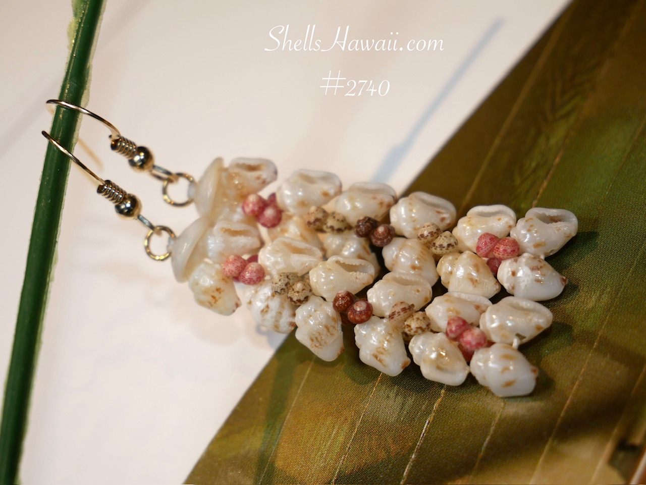 These Niʻihau shell earrings are created in the traditional Heleconia style using genuine Momi shells accented with Kahelelani shells. The layered arrangement of shells reflects the beautiful form of the heliconia flower often seen in tropical gardens. This design highlights the natural beauty of Hawaiian shell jewelry and the delicate craftsmanship behind each piece of Niʻihau shell jewelry (ハワイアンジュエリー).