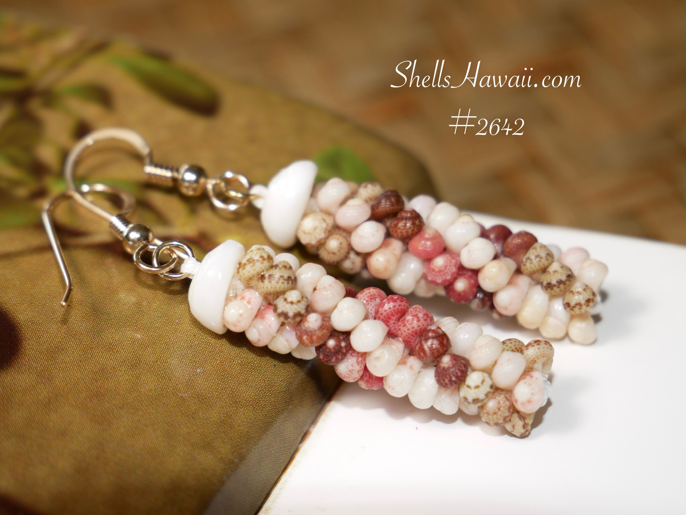 Materials: Genuine Kahelelani shells — Tuaʻula kamoa (off white), ʻomaʻomaʻo (green), mākuʻe (brown), and ʻākala (pink); white Puka tops; 14K gold-filled findings
