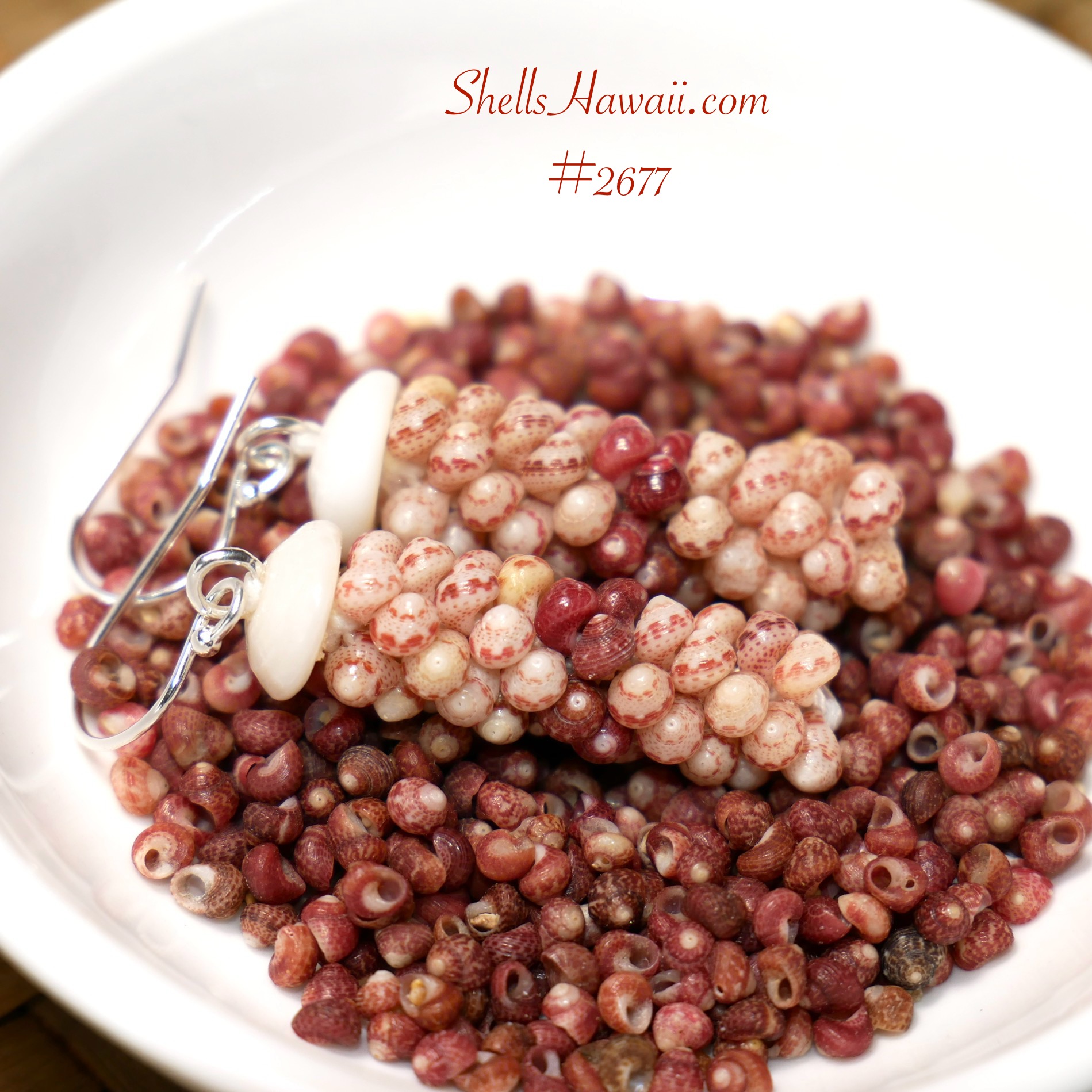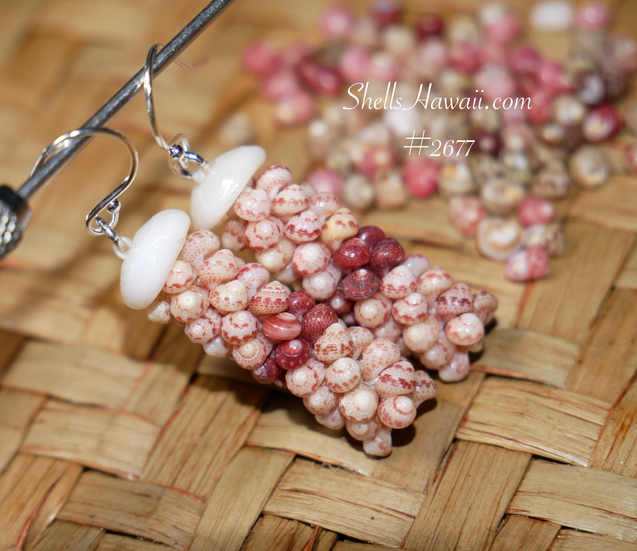 The design features a stunning blend of Kahelelani Keʻokeʻo (white), Kahelelani ʻĀkala Pua (pink flower), Kahelelani ʻUlaʻula (deep red and burgundy tones), and Kahelelani Kamaʻo (white creamy tones). The rich mix of warm and rosy hues gives these earrings a soft yet striking presence — a reflection of the Hawaiian sunset in shell form.