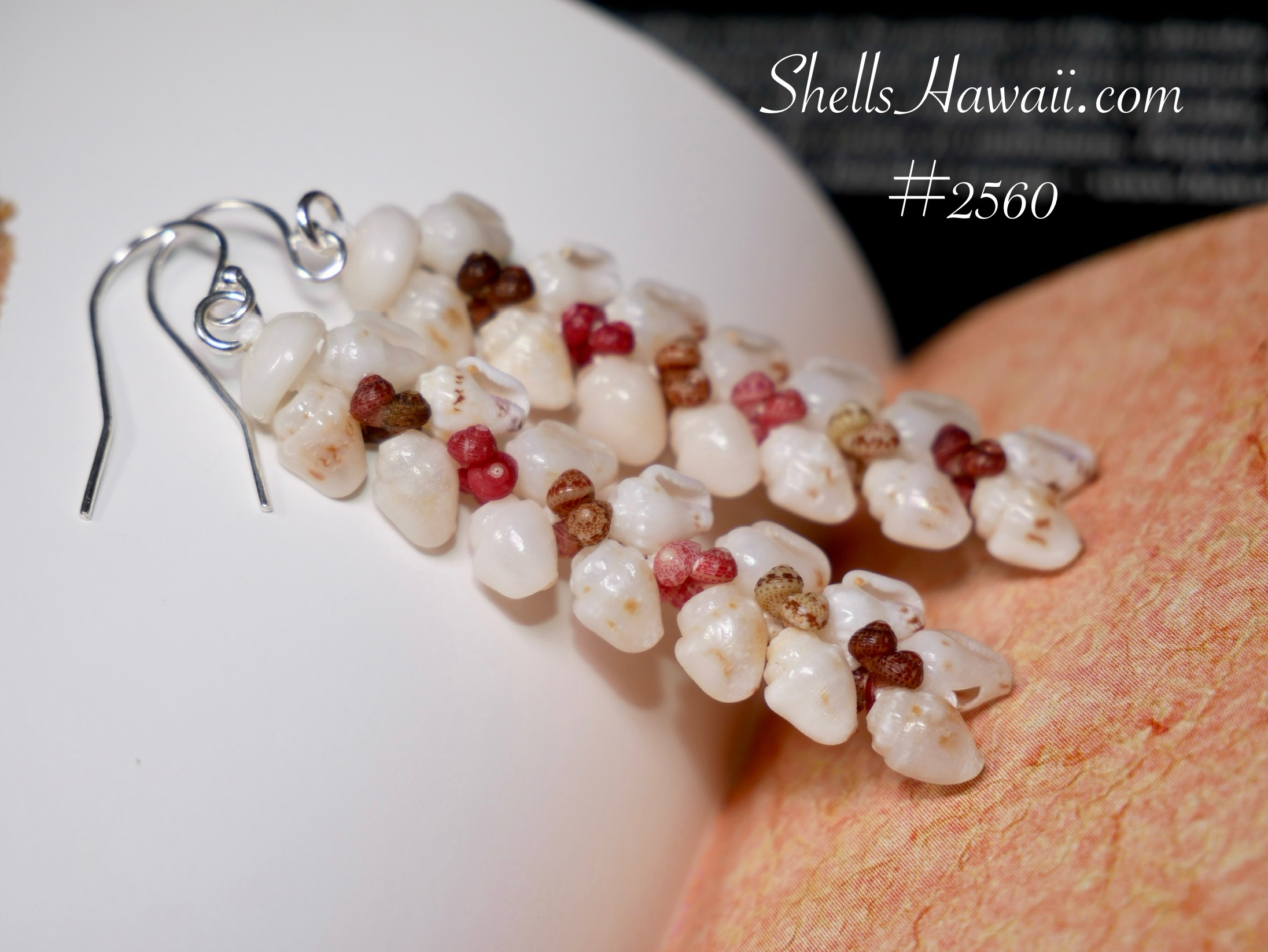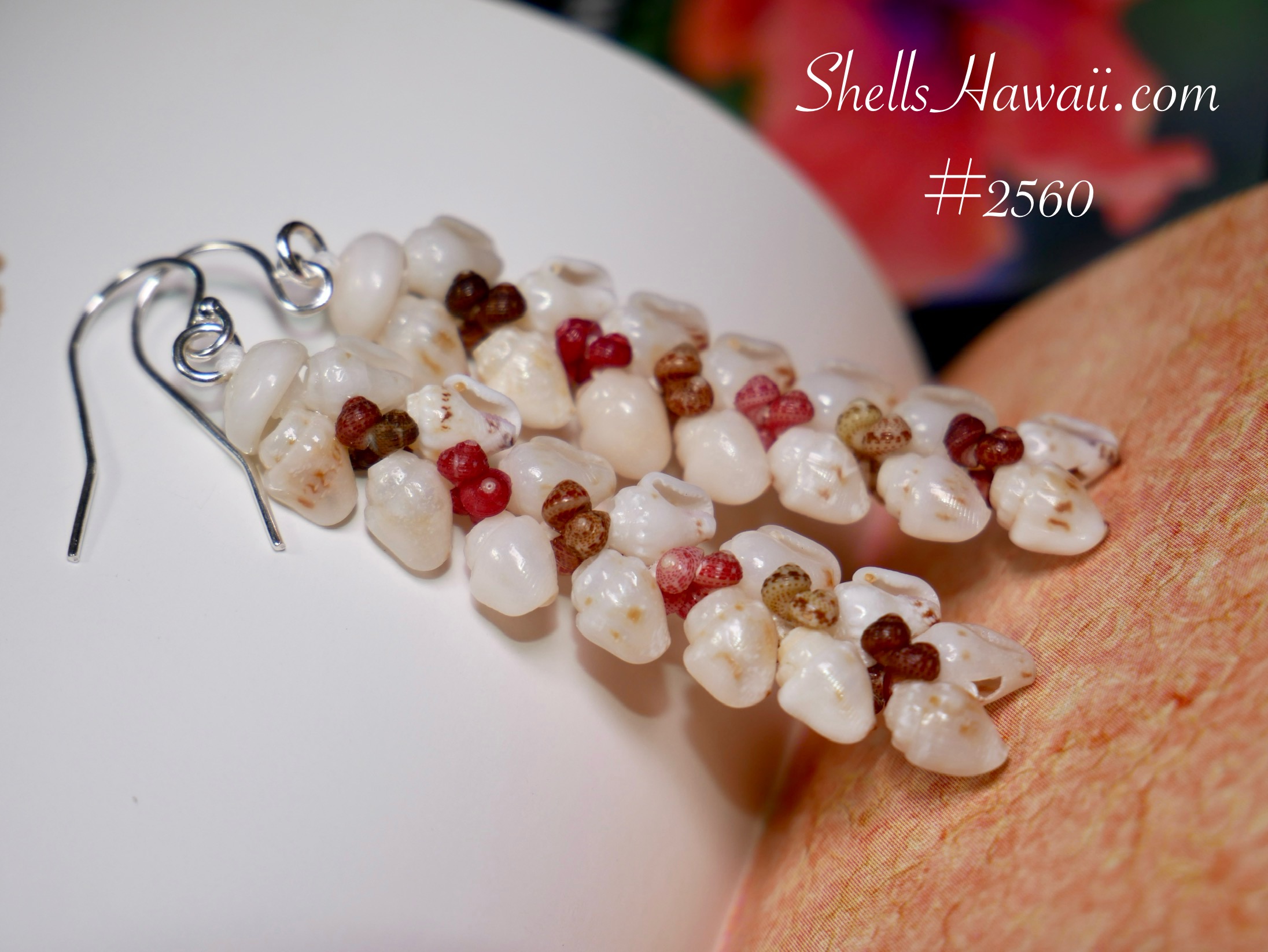 Inspired by the vibrant Heliconia flower, these earrings are handcrafted with off-white Momi shells prized for their high luster, paired with a rich mix of Kahelelani shells in brown, green, pink, chocolate, and red tones. The colorful arrangement reflects the natural beauty of Hawaiʻi’s flora while honoring the traditional artistry of Niʻihau shell jewelry.