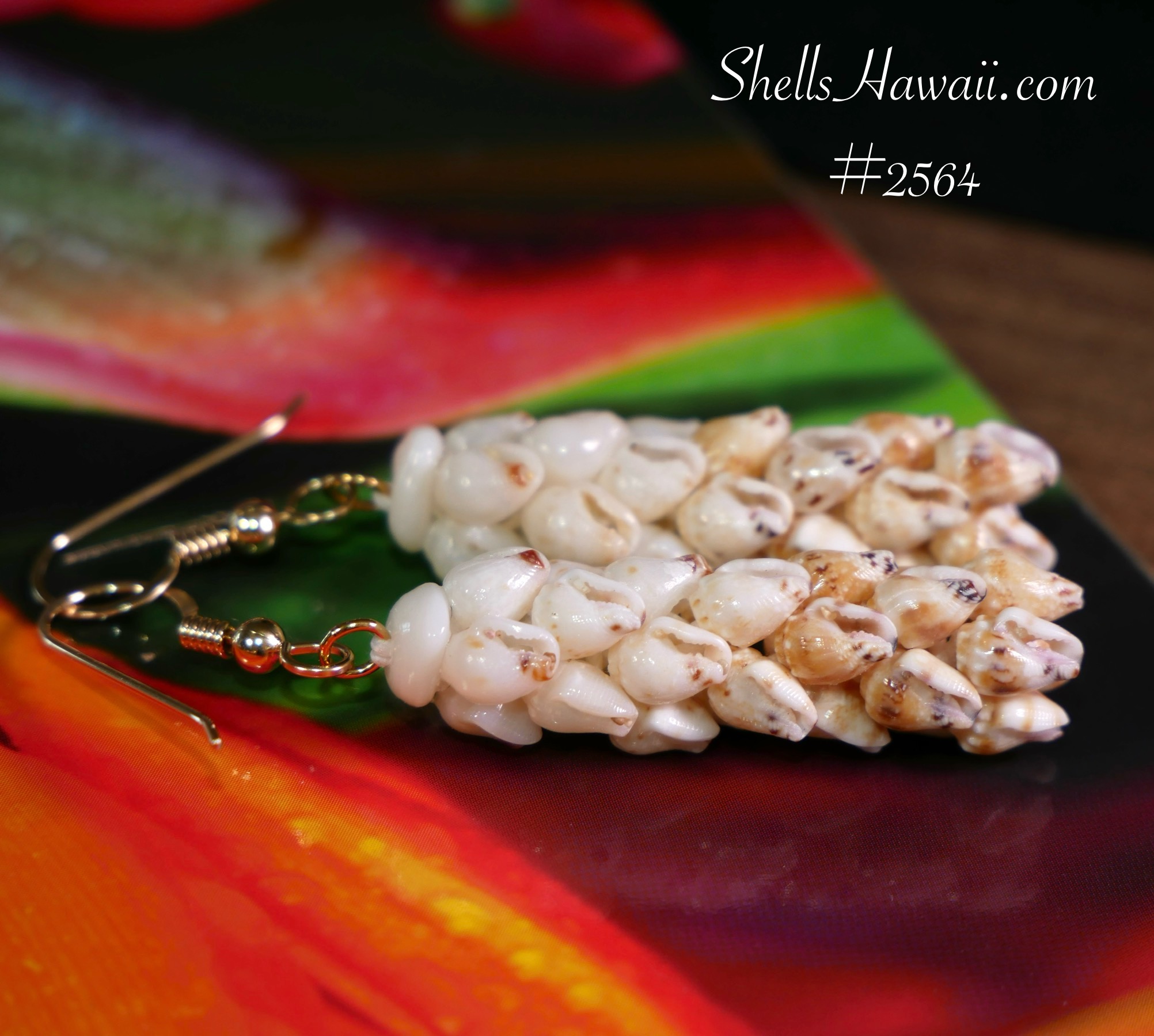 These elegant earrings are crafted in the traditional Coconut style, inspired by the male inflorescence of a coconut palm. Strung with delicate off-white and yellow Lenalena Momi shells, the four strands cascade gracefully—bringing a natural, island-inspired flow to your look, full of aloha.