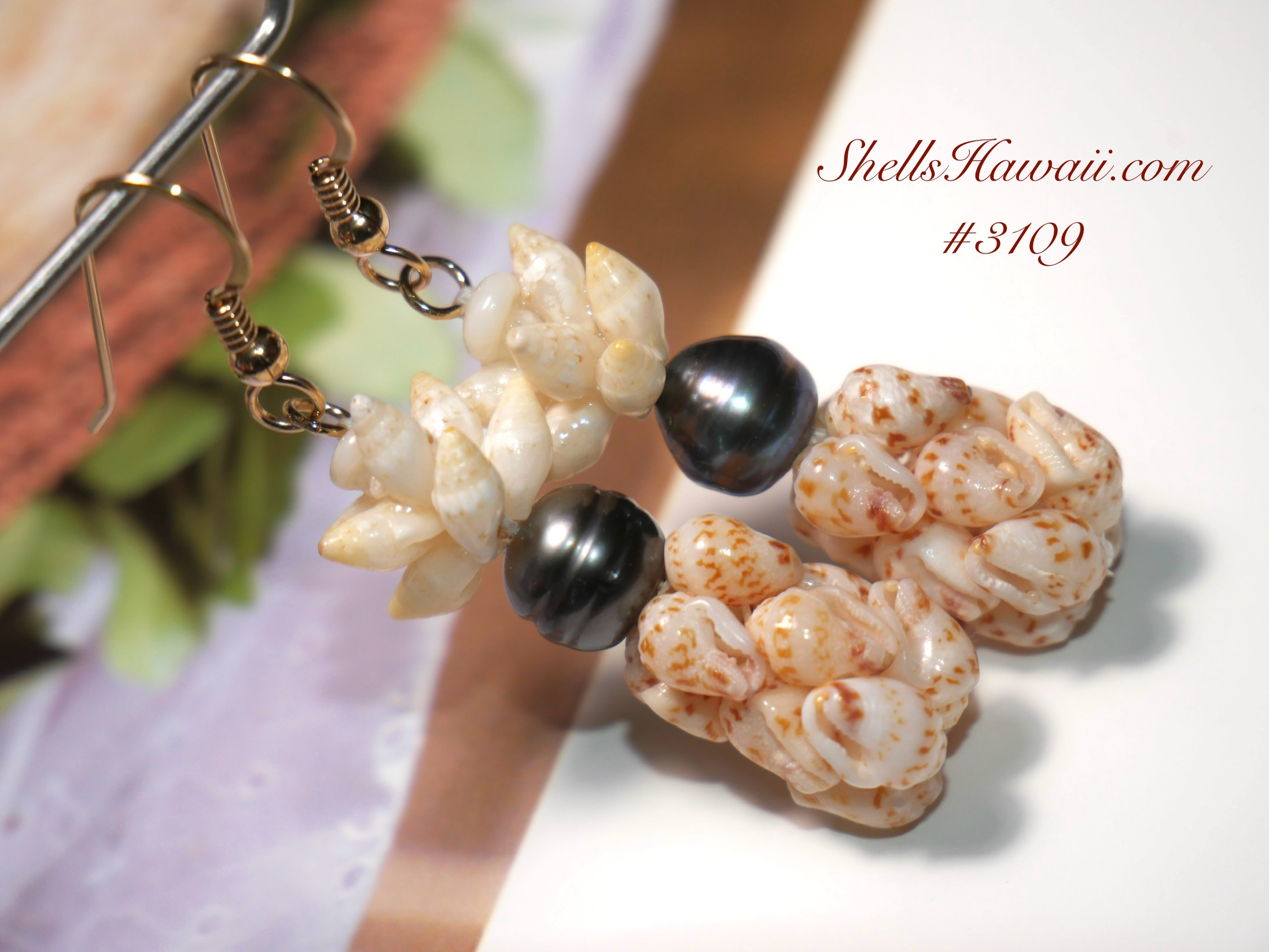 Handcrafted from brown-spotted ʻŌnikiniki ʻĀhiehie Momi shells and delicate Laiki shells, each pair is accented with a lustrous 8mm+ Tahitian pearl in a peacock tone. The earthy shell colors contrast beautifully with the iridescence of the pearl, creating a unique design that blends warmth, elegance, and tradition.