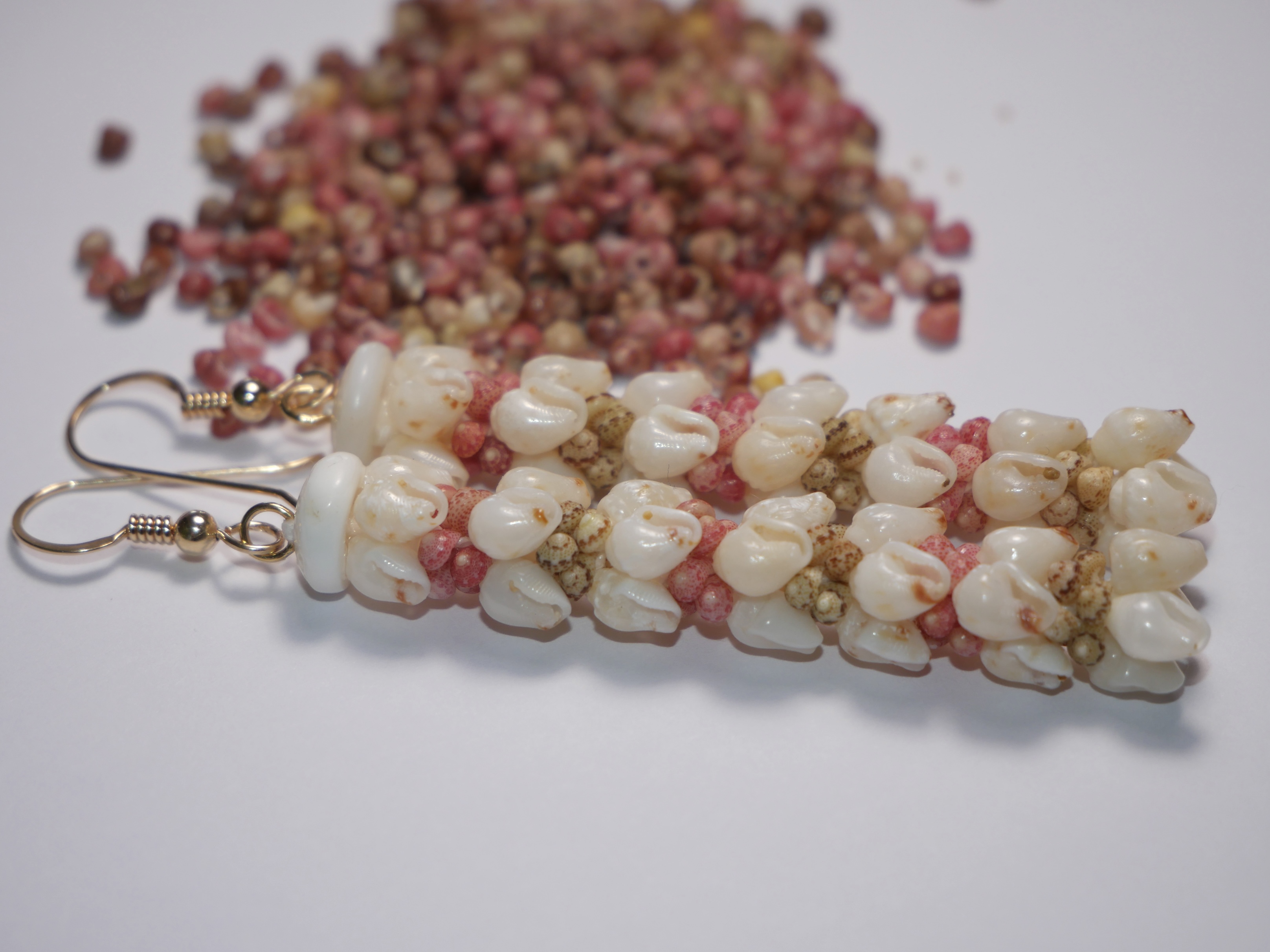 This is Momi & Kahelelani shell earrings. This earrings made of off white Momi shells, pink and green Kahelelani shells accents. This style of earrings call kipna style because it use more than one type of shells.