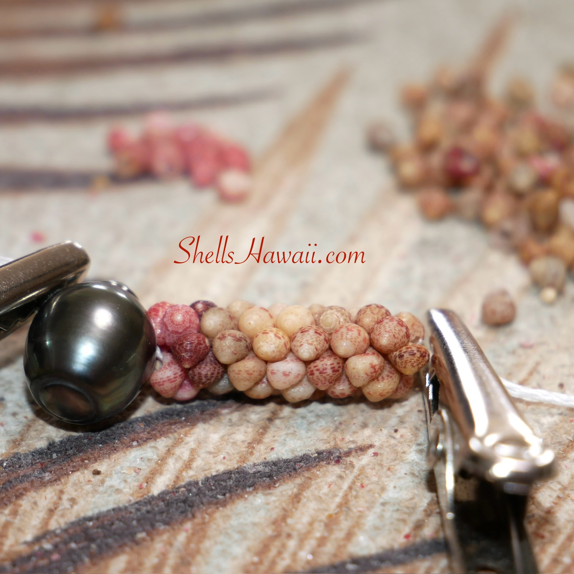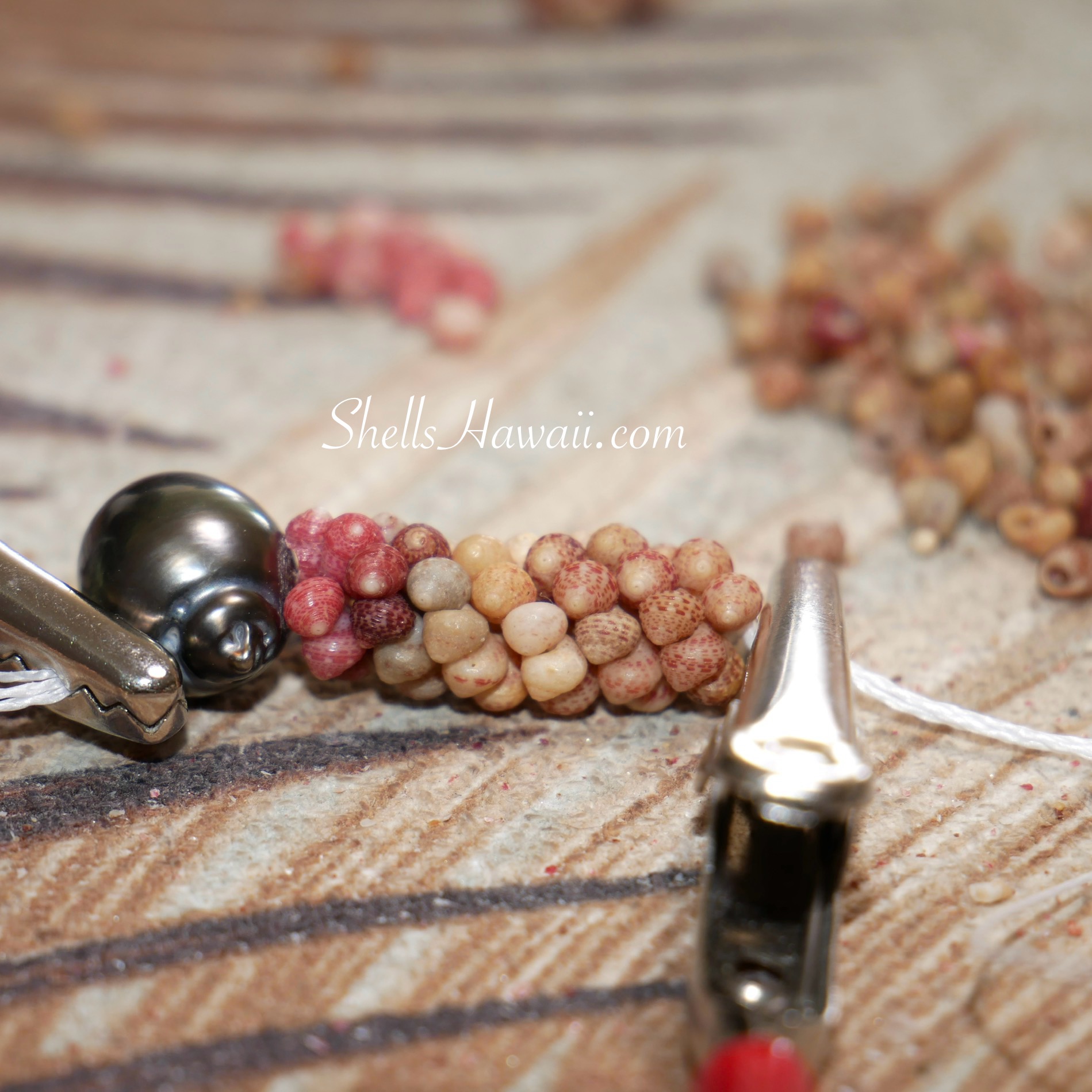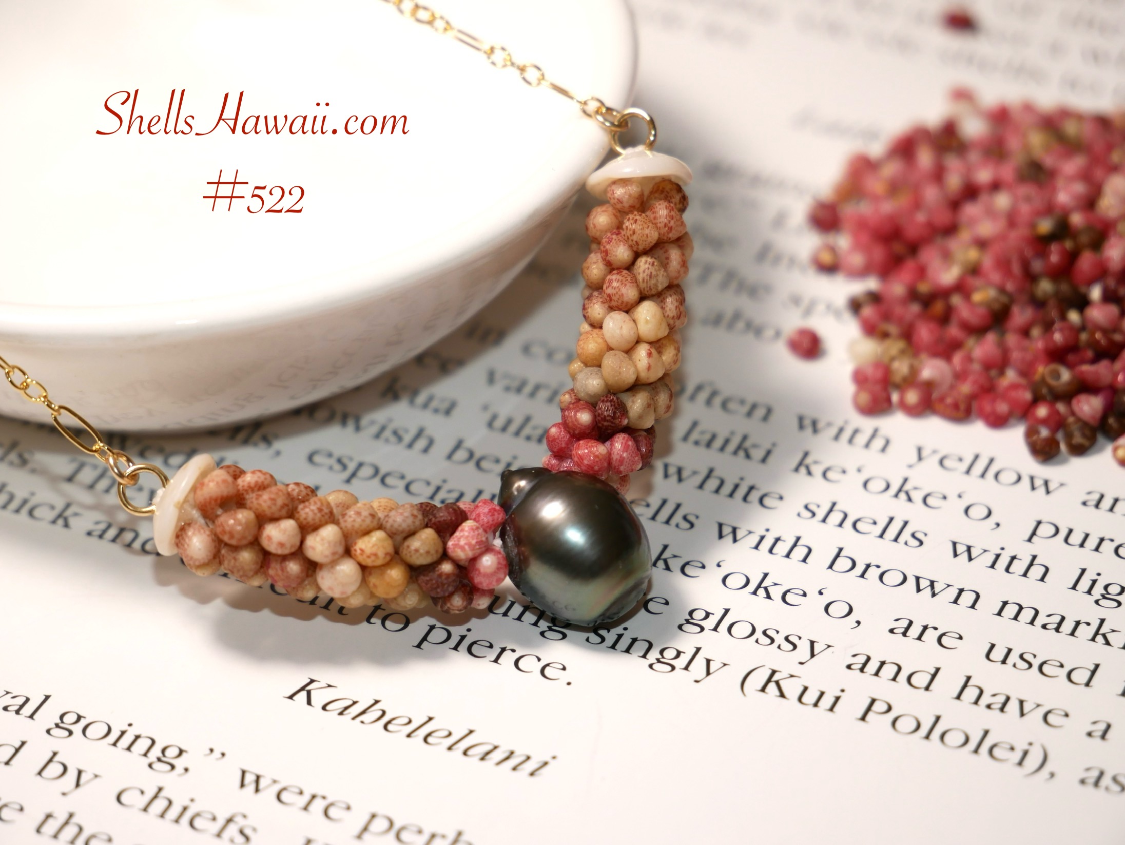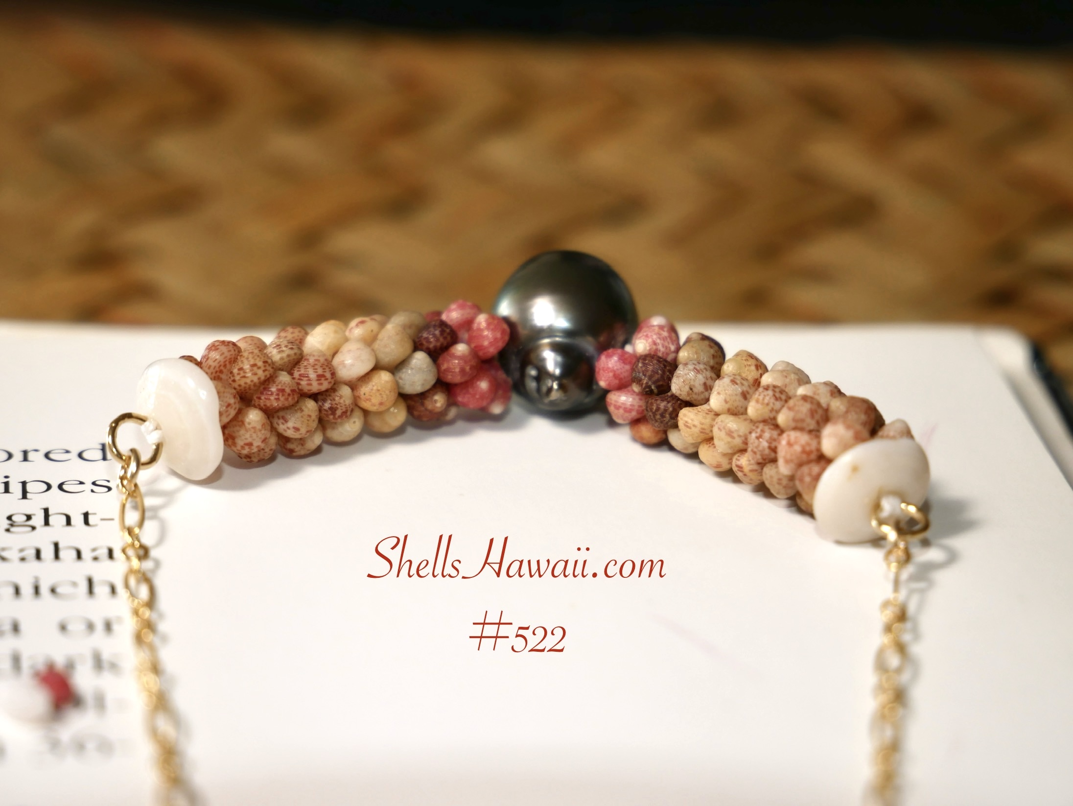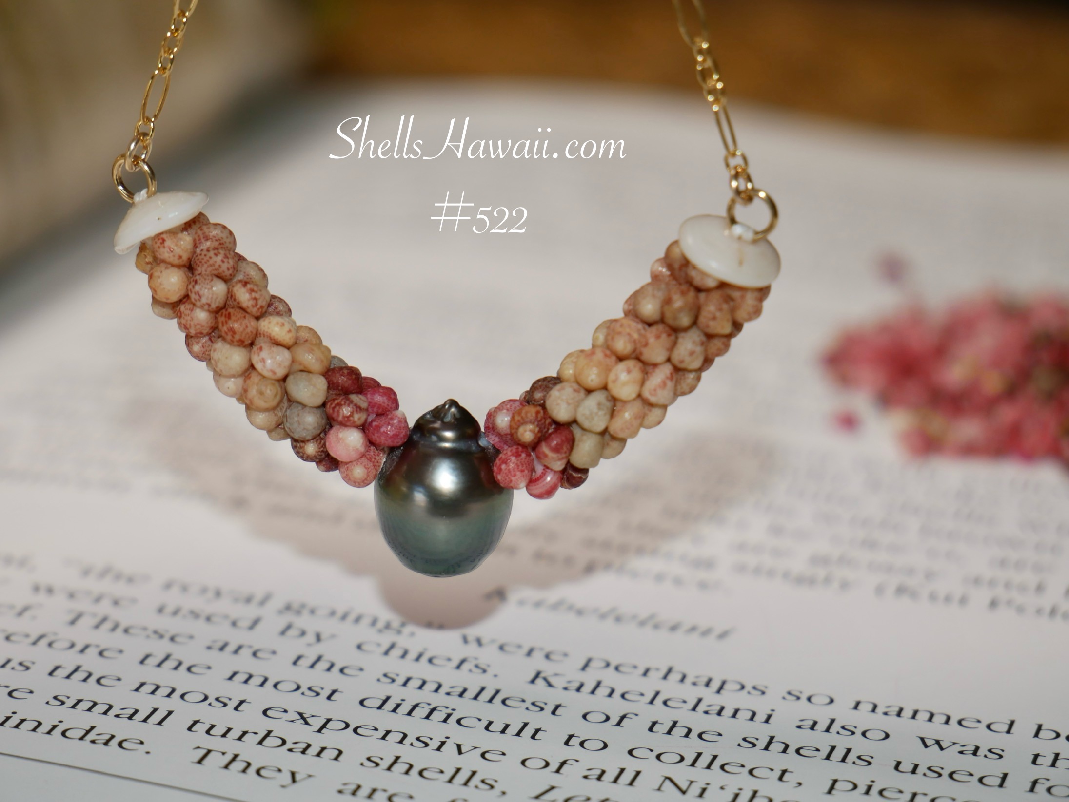 Materials: Genuine Kahelelani shells from Kauaʻi (dark pink, light pink, burgundy, gray, off white, natural brown); white Puka tops; 10.27 mm peacock Tahitian pearl; 14K gold-filled fancy Italian chain