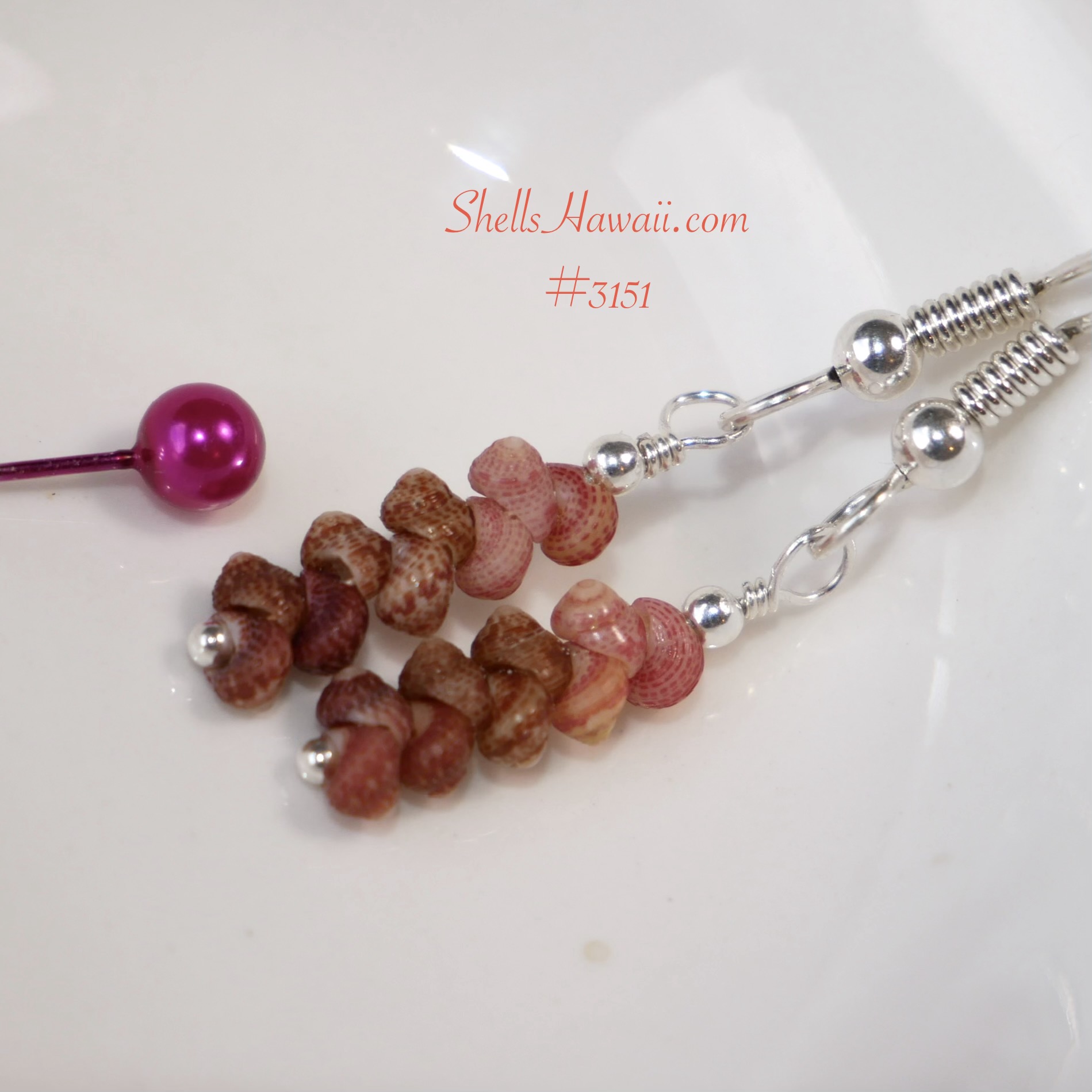 This delicate pair of Hawaiian shell earrings features tiny Kahelelani shells from Kauaʻi in rich burgundy, chocolate, and soft pink tones, creating a warm and natural color blend inspired by the ocean. The minimalist drop style allows each shell to stand out, highlighting the unique patterns and beauty of Hawaiian shell jewelry.