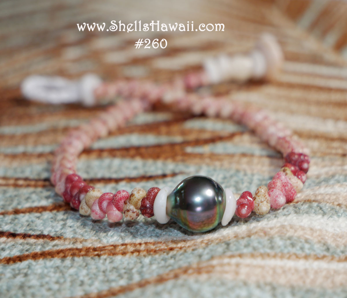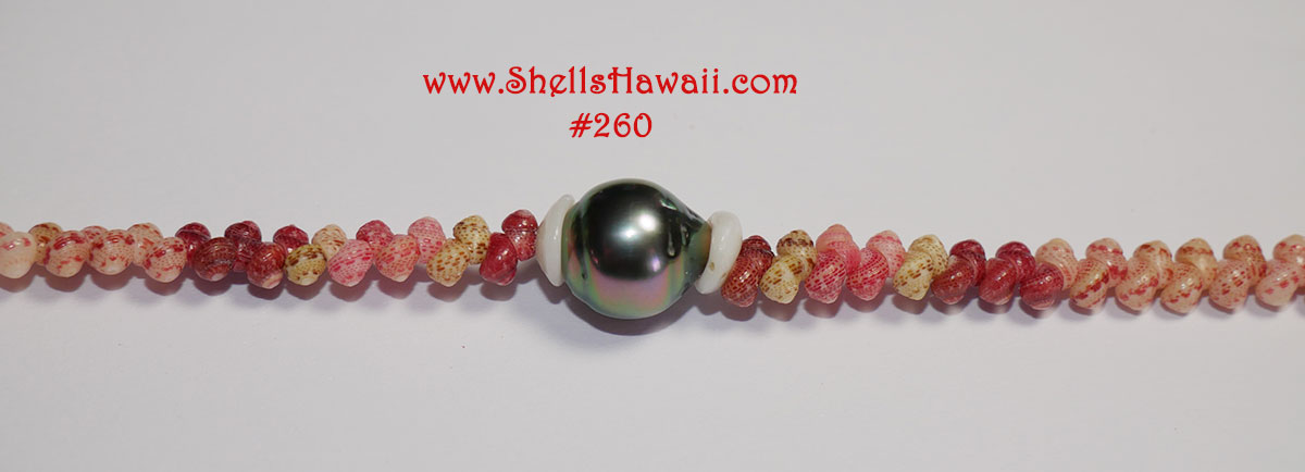 This is a single strand Kahelelani shells with Tahitian pearl centerpiece bracelet. This bracelet design in herringbone style or Mauna loa style. This bracelet using common, red burgundy, green (oma'oma'o)
