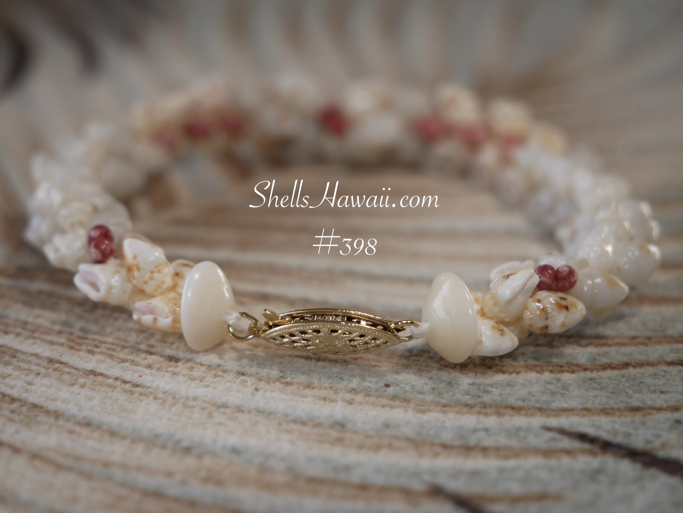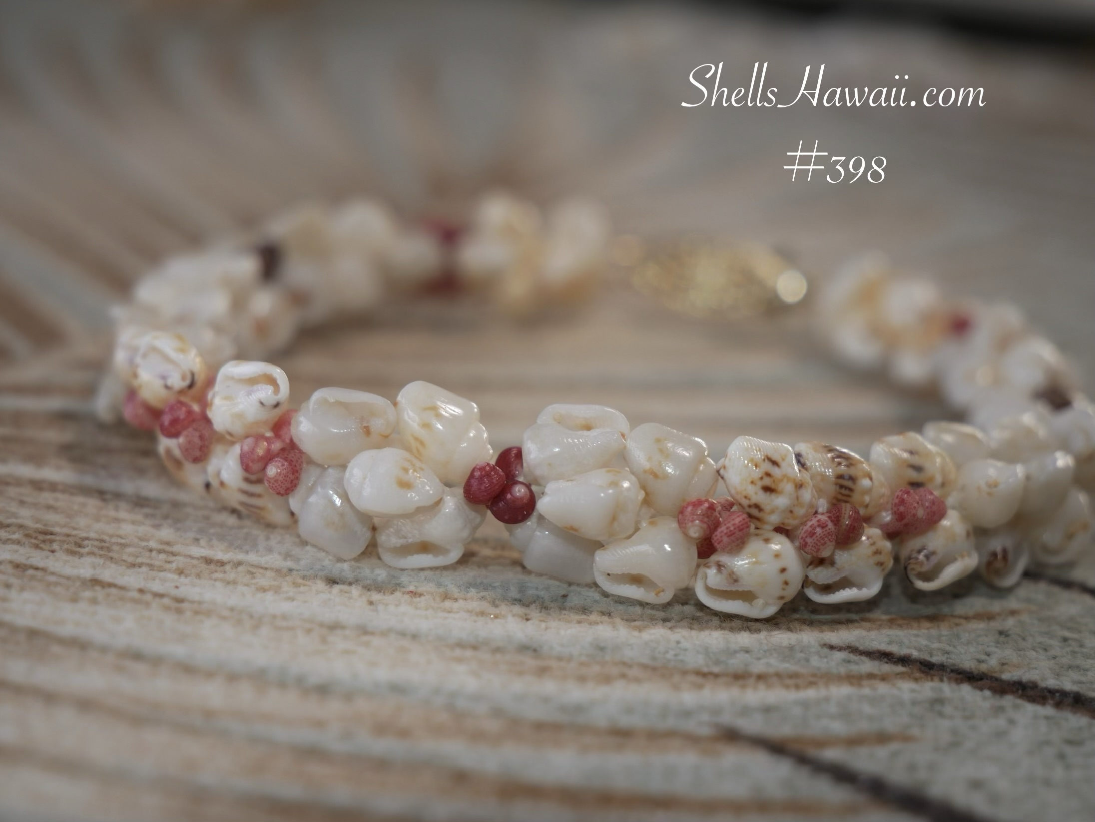 This Niʻihau shell bracelet is created in a Kipona style, combining Momi and Kahelelani shells into a soft, natural design. Creamy off-white Momi shells are gently blended with touches of light blue ʻŪliʻuli, warm yellow Lenalena, and delicate pink and burgundy tones, creating a Hawaiian shell jewelry piece that feels balanced, lively, and easy to wear.